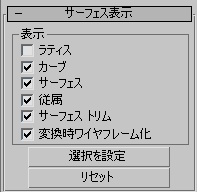 [サーフェス表示](Surface Display)ロールアウトのコントロールは、NURBS サーフェス オブジェクトの表示コントロールとほとんど同じですが、[選択を設定](Set Selected)と[リセット](Reset)の 2 つのボタンが追加されています。