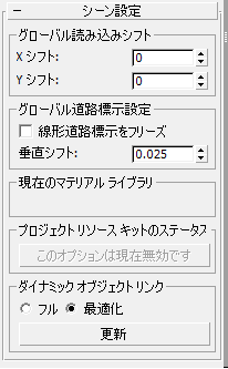 読み込んだデータを取り込む際の X と Y のシフト値を設定します。 これは、ソース データが実際のワールド座標系で生成された場合に便利です。 このような座標系は 3ds Max での使用には適さず、システムの精度とパフォーマンスに大きな影響を与える場合があります。