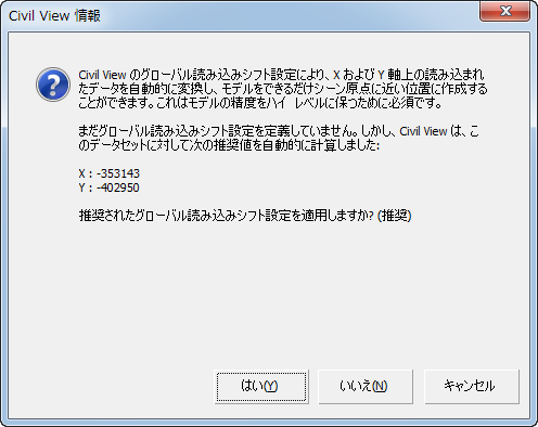 原点が 0 以外のモデル データを読み込むと、Civil View では X と Y のシフト値を計算し、その値を設定するためのプロンプトを表示します。