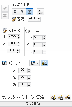 このパネルは、ペイント オブジェクトのパラメータ(位置合わせ、間隔、スケールなど)を設定するために使用します。このパネルから設定を保存およびロードすることもできます。