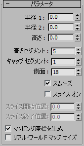 既定値では、底面の中心に基点をもつ、18 側面からなる滑らかな円形チューブが生成されます。[高さセグメント](Height Segments)は 5、[キャップ セグメント](Cap Segments)は 1 です。[ベンド](Bend)モディファイヤなどを使って円柱の形状を変更しない場合は、[高さセグメント](Height Segments)を 1 に設定して、シーンの複雑度を下げます。円柱の終端を変更する場合は、[キャップ セグメント](Cap Segments)の値を増やしてみてください。