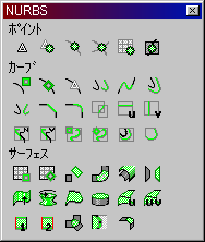 ツールボックス内のボタンを使用して NURBS サブオブジェクトを作成します。ツールボックスの一般的な機能は次のとおりです。