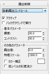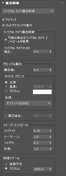 このコントロールは、[レンダリング](Rendering)メニュー > [環境](Environment) > [環境と効果](Environment and Effects)ダイアログにあるコントロールの複製です。詳細については、「フィジカル カメラ露出制御(Physical Camera Exposure Control)」を参照してください。