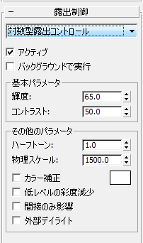 [対数型露出コントロール](Logarithmic Exposure Control)を選択すると、輝度、コントラスト、およびシーンが自然光の野外かどうかを使用して、物理値を RGB 値にマッピングします。対数型露出コントロールは、ダイナミック範囲の高いシーンの場合により適しています。