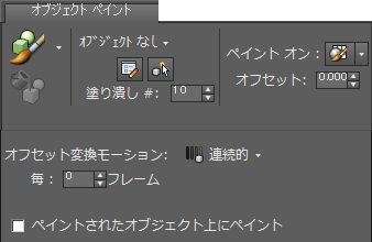 シーンにペイントする 1 つまたは複数のオブジェクト。既定値では、このフィールドには「オブジェクトなし」(ペイント オブジェクトが指定されていない場合)、またはオブジェクト リストの最後のオブジェクトの名前(以下を参照)が表示されます。これ以外に、次のいずれかを選択できます。