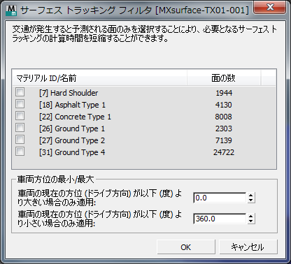 このダイアログ ボックスでは、使用するマテリアル ID を 1 つ以上選択する必要があります。 たとえば、車両にサーフェスのアスファルト部分(路肩や地表ではない)をトラックさせるとします。 この方法でサーフェスをフィルタすると、Civil View でサーフェス トラッキングの計算に要する時間を削減できます。