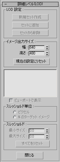 この領域の[幅](Width)、[高さ](Height)編集ボックスは、[詳細レベル](Level of Detail)ユーティリティを開くたびに、現在のレンダリング出力サイズに設定されます。これらの編集ボックスを使って、レンダリング出力を任意の解像度に変更できます。[% のターゲット イメージ](percent of Target Image)オプションを選択している場合は、[ターゲット イメージ サイズ](Target Image Size)を変更すると、しきい値も変更されます。