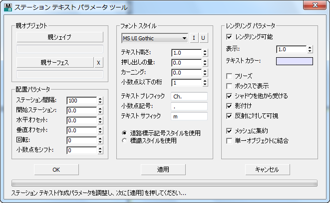 - 3ds Max システム単位でのステーション テキスト文字の押し出しの深さを設定します。