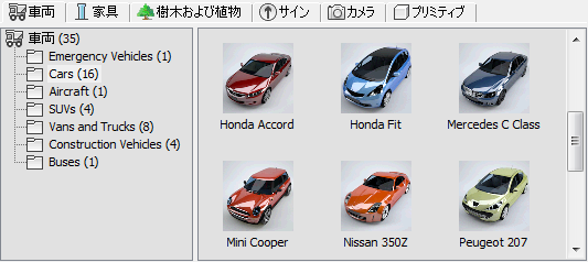 Civil View オブジェクト ライブラリは、オブジェクトは位置スタイル エディタの内容の基本を形成します。このパネルは、オブジェクトを配置されたオブジェクトのカテゴリから現在のシーンに移動します。