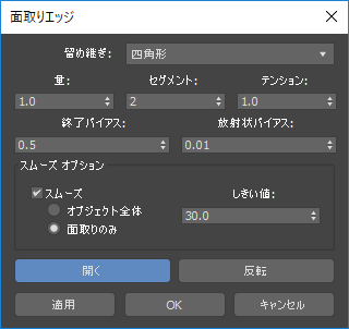 [面取り設定](Chamfer settings)ダイアログ、エッジ/境界サブオブジェクト レベル