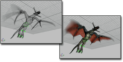上: [モーション ブラー](Motion blur)が空飛ぶ竜の翼に適用される。