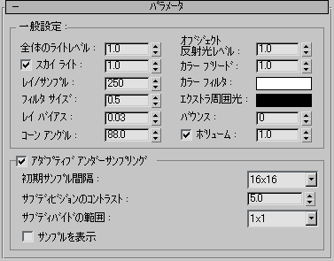 ヒント: アダプティブ アンダーサンプリングを使う場合、[サブディビジョンのコントラスト](Subdivision Contrast)の値を調節して、最善の結果を得るようにします。このコントロールの効果は、レイ/サンプルの値に依存します。