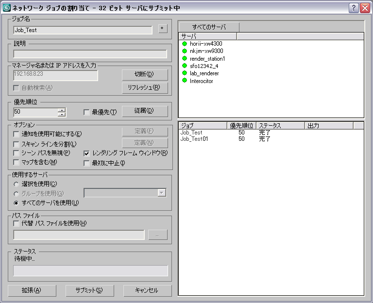 マネージャはサーバにジョブをサブミットし、サーバでレンダリングが開始します。