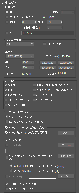 [共通パラメータ](Common Parameters)ロールアウトでは、すべてのレンダラーに共通のパラメータを設定します。