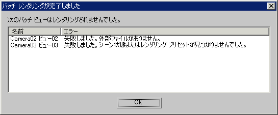 どのバッチのレンダリングが未完了かはこのダイアログで通知します。可能な場合は、失敗の理由も記載します。
