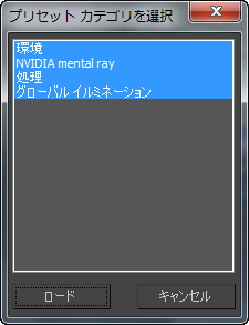 各カテゴリは、[レンダリング設定](Render Setup)ダイアログ ボックスのパネルに対応しています。RPS ファイルからロードするパネルの設定を選択し、[ロード](Load)をクリックします。カスタム プリセット ファイルを保存すると、そのファイルの名前が既定値とともにドロップダウン リストに表示されるようになります。