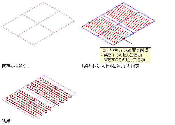 | スラブ、屋根スラブ、壁、または 1 つまたは複数の柱通芯セル内で梁を垂直に配列するには([配列]が[はい]の場合) | カーソルを、エッジの上で配列のプレビューが表示されるまで移動し、クリックします。新しい梁が、プロパティ パレット上で選択した[レイアウト方法]に従い、選択したエッジに垂直に配列されます。柱通芯のすべてのセルに対する配列を追加するには、クリックする前に[Ctrl]キーを押します。[Enter]を押して、コマンドを終了します。 |