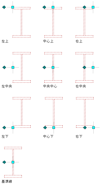 | 部材形状の 9 つの位置のいずれかに沿って部材の軸を配置するには | [位置合わせ]で 9 つの位置のいずれかを選択します。 |