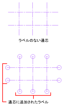 注: 既存のカスタム柱通芯に通芯線を追加すると、自動ラベル付けのサポートなしに、既定値(「-」)のラベルが自動的に生成されます。通芯線を削除すると、自動ラベル付けはサポートされません。