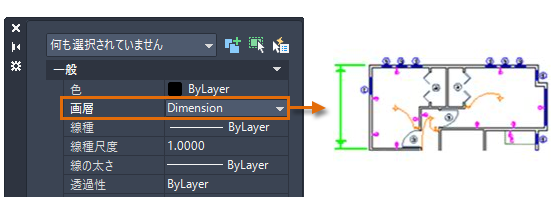 図面で 現在のプロパティを指定すると、新しく作成されるすべてのオブジェクトでこれらの設定が自動的に使用されます。たとえば、 現在の画層を寸法に設定すると、作成するオブジェクトは寸法画層に作成されます。