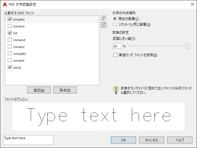 - 選択した SHX ジオメトリに一致する最も近いフォントを選択するための SHX フォントのリストが表示されます。選択した SHX フォントの順序は重要です。指定した認識しきい値に一致するか超えるまで、リストの上から順に、選択したフォントと選択した SHX ジオメトリが比較されます。選択したフォントをリストの上または下に移動するには、矢印コントロールを使用します。チェック マークの付いていないフォントは無視されます。次の点に注意してください。