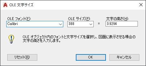 OLE オブジェクトのサイズを図面に挿入されたときのサイズにリセットします。
