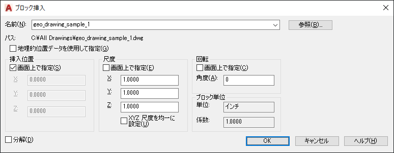 挿入するブロックまたは図面の名前と挿入位置を指定します。