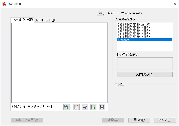 標準のファイル選択ダイアログ ボックスが表示されて、図面ファイルを選択して変換リストに追加できます。このボタンは[ファイル ツリー]タブと[ファイル リスト]タブの両方で使用可能です。