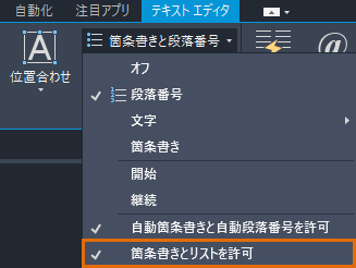 - [テキスト エディタ]リボン コンテキスト タブの[段落]パネルで、[箇条書きと段落番号]をクリックします。[段落番号]を選択します。