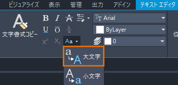 - [テキスト エディタ]リボン コンテキスト タブの[書式設定]パネルで、[大文字/小文字を変更]をクリックします。[大文字]を選択します。