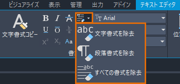 - [テキスト エディタ]リボン コンテキスト タブの[書式設定]パネルで、[クリア]をクリックし、使用可能なオプションから選択します。