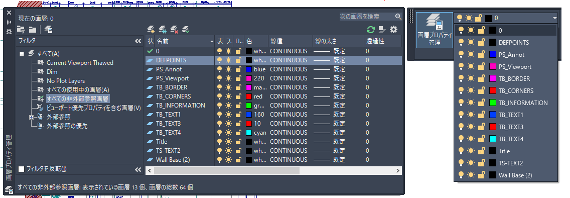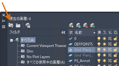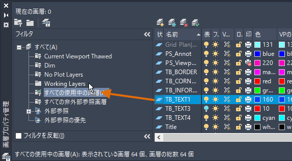 - および[フリーズ解除]に設定されている画層のすべてが画層フィルタに含まれるように指定しています。