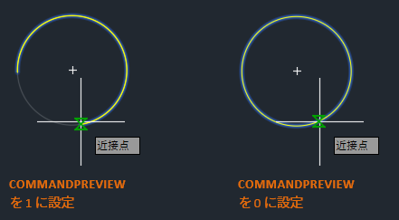 - システム変数 COMMANDPREVIEW が 1 に設定されていることを確認します。コマンド プレビューをオンにすると、コマンドの使用中に結果のプレビューが表示されます。