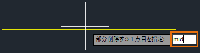 - [中点(MID)]オブジェクト スナップを使用し、部分削除の 1 点目として線分の中点を指定します。