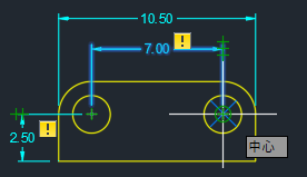寸法に、円との関連付けが解除されたことを示す黄色のバッジが表示されます。中央の円を削除したことで、2 つの非自動調整寸法が作成されました。