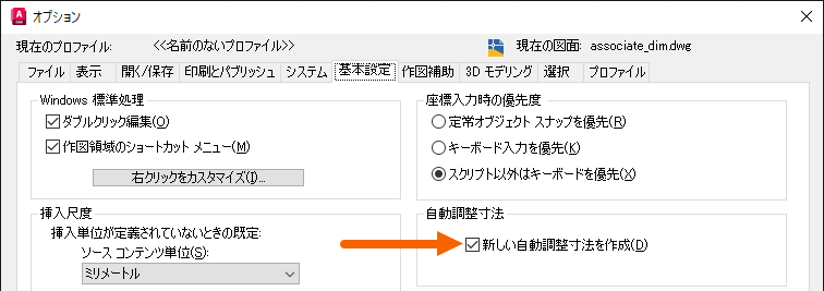 2. [オプション]ダイアログ ボックスの[基本設定]タブの[自動調整寸法]領域で、[新しい自動調整寸法を作成]がオンになっていることを確認します。