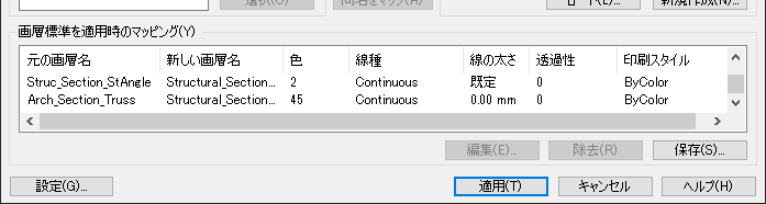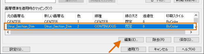 1. [画層標準を適用時のマッピング]領域で、[元の画層名]列の Struc_Section_Dim を選択し、[編集]をクリックします。