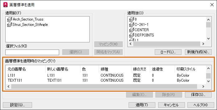 2 つの図面間で同じ名前を持つすべての画層が、ダイアログ ボックスの下部にある[画層標準を適用時のマッピング]領域に追加されます。マッピングされていない 2 つの画層が残ります。