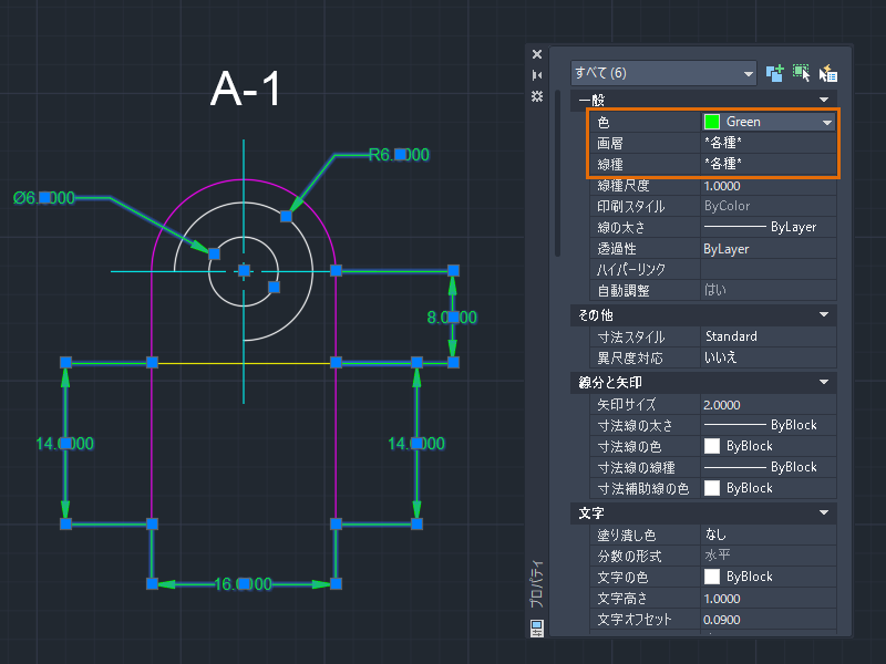 寸法は同じ色で表示されていますが、寸法に割り当てられている画層と線種が統一されていません。