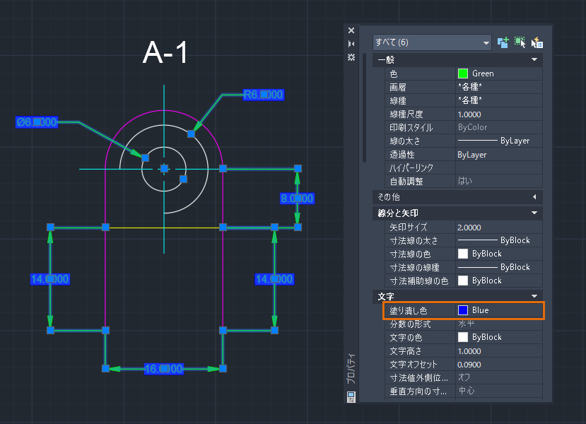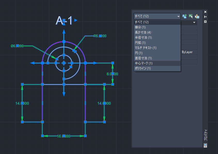 1. [プロパティ]パレットを開いている状態で、 をクリックしてから図面内のすべてのオブジェクトを選択し、[Enter]を押します。