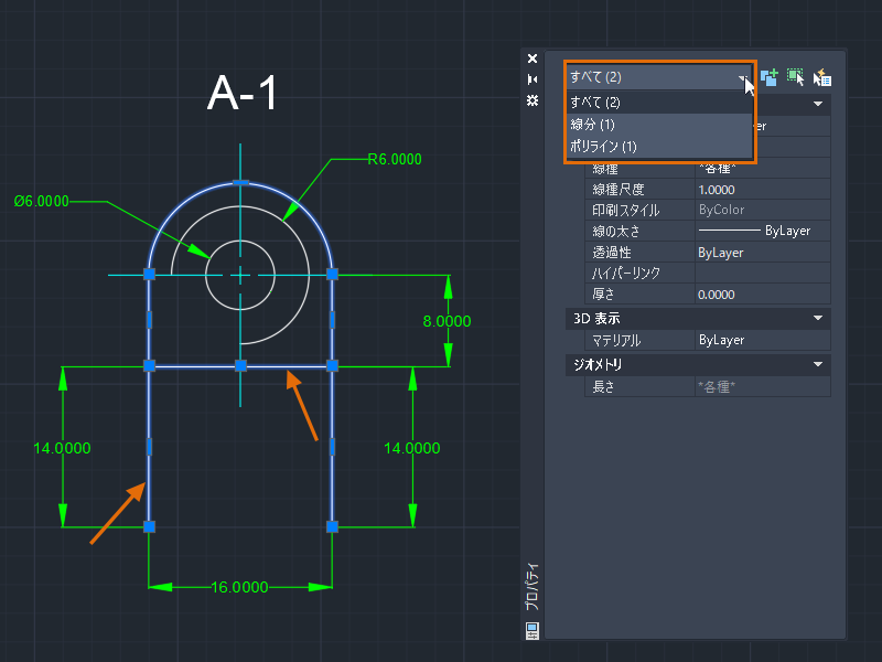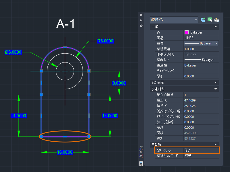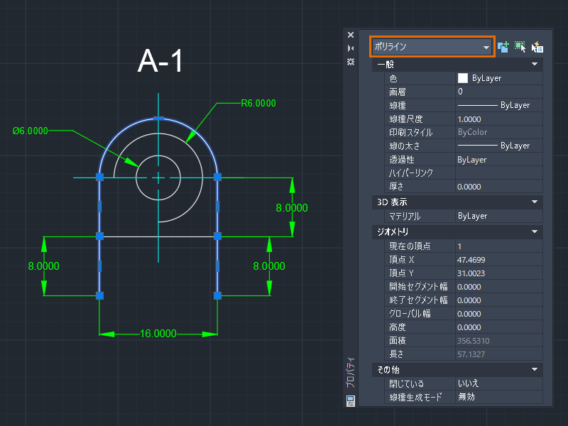 1. [プロパティ]パレットを開いている状態で、ポリラインを選択します。