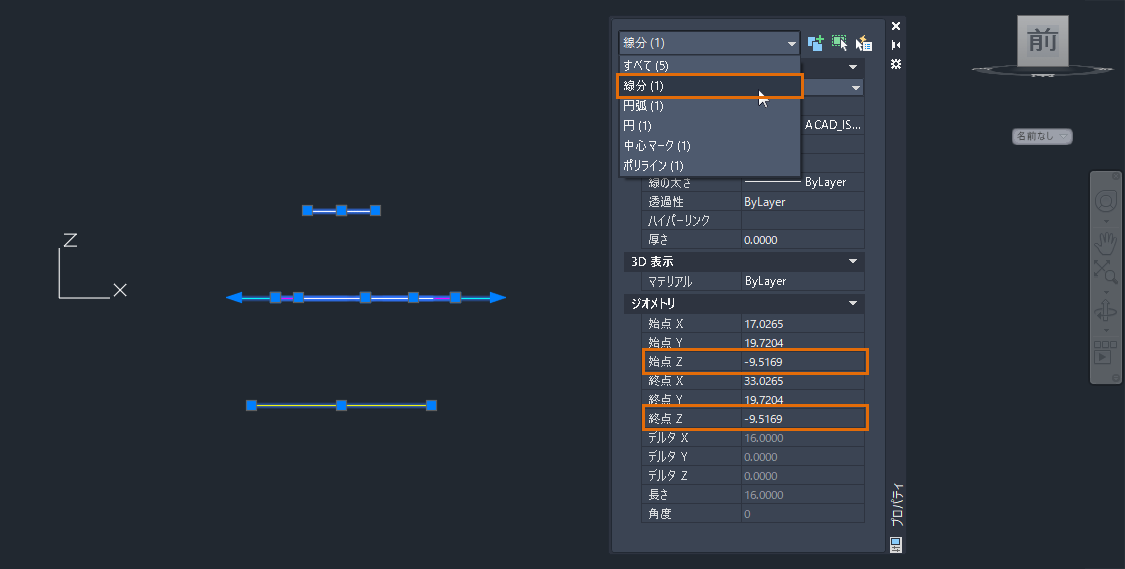 オブジェクトが異なれば、Z 軸プロパティの名前も異なります。オブジェクトには、次のプロパティの 1 つまたは組み合わせが存在する可能性があります: 始点 Z、終点 Z、位置 Z (マルチ テキスト)、中心 Z (円)、高度(ポリライン)。