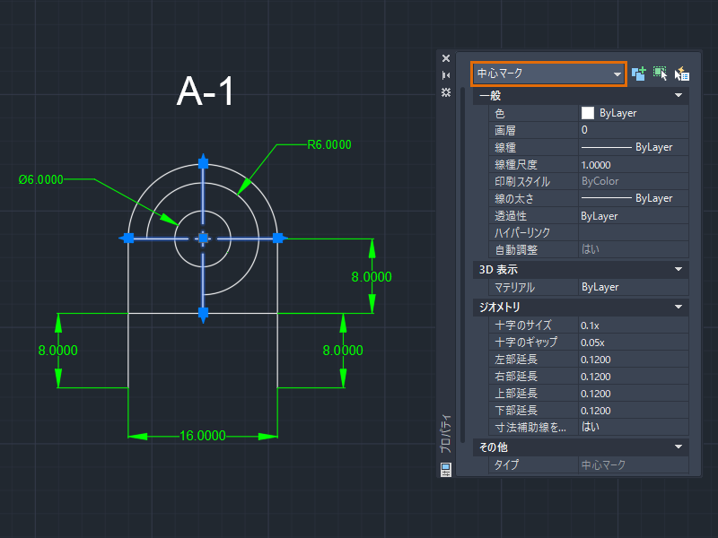 [プロパティ]パレットに選択した中心マークのプロパティが表示されます。