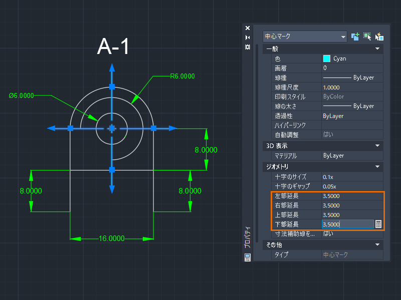 5. 個々の中心線の寸法補助線を延長するには、[ジオメトリ]領域で、[左部延長]、[右部延長]、[上部延長]、[下部延長]の各値を変更します。この例では、すべての拡張子を 3.5000 に変更しています。