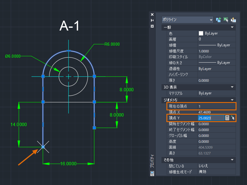 これで、ポリラインの最初と最後の頂点が位置合わせされました。この方法による頂点編集は、必要な絶対座標がわかっている場合に便利です。