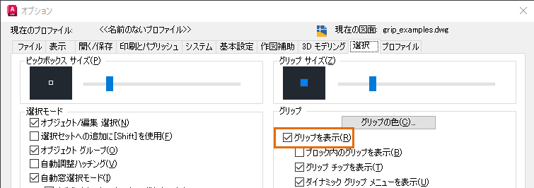 | GRIPOBJLIMIT | 指定した数以上のオブジェクトが選択セットに含まれる場合、グリップの表示を省略します。 | 100 | レジストリ |