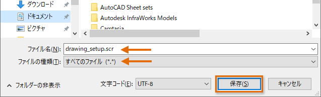 [ファイル名]テキスト ボックスで、既定の文字列を選択してから、drawing_setup.scr と入力します。
