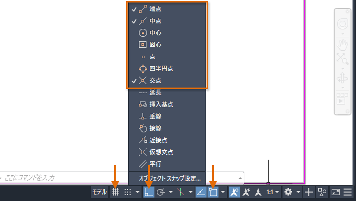 [端点]、[中点]、[交点]定常オブジェクト スナップを設定する