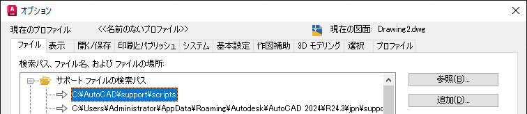 注: [オプション]ダイアログ ボックス(OPTIONS[オプション]コマンド)の[ファイル]タブで、[AutoCAD サポートファイルの検索パス]設定のフォルダを管理することができます。[AutoCAD サポートファイルの検索パス]設定にフォルダを追加する方法については、「