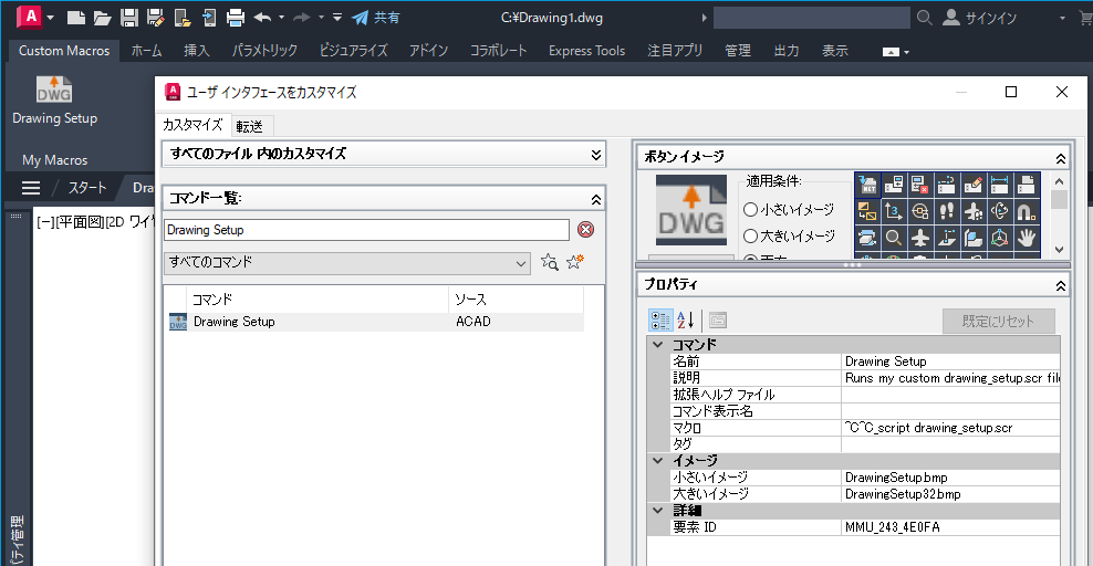 SCRIPT[スクリプト実行]コマンドを使用してマクロを定義し、リボンのボタンから特定のスクリプトを実行することができます。次に、SCRIPT[スクリプト実行]コマンドを開始し、drawing_setup.scr という名前のスクリプト ファイルを実行するマクロを示します。